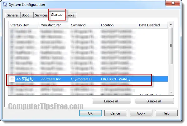 Step 2: Now go to the Startup tab and locate the item named PPS 网路加速器 by PPStream Inc. Uncheck (untick) the item and then click on Apply -> Ok.